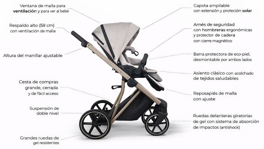 - Ventilación panorámica para mantener una buena circulación de aire, y una capota extensible con filtro UV que protege frente al sol, el viento y la lluvia ligera.