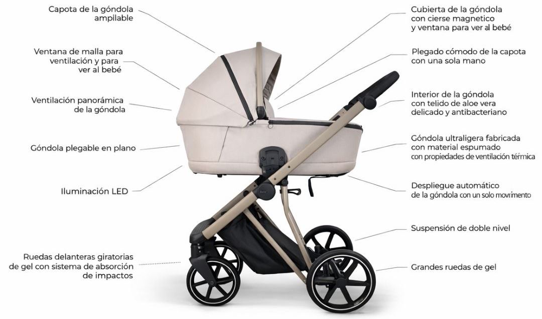 - Estructura de material espumado ultraligero hace que el capazo sea ligero, resistente y fácil de manejar.