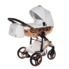 El Cochecito Enzo presenta un hermoso bordado, rematado con hilo de lurex para un toque elegante. Este impresionante cochecito, con su diseño de capazo en forma de diamante, está disponible en una variedad de combinaciones de colores: rosa-plata, negro-oro, blanco-oro y cobre-blanco. ¡Elige el color que mejor se adapte a tu estilo y prepárate para pasear con elegancia!