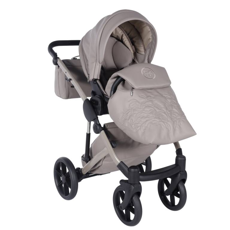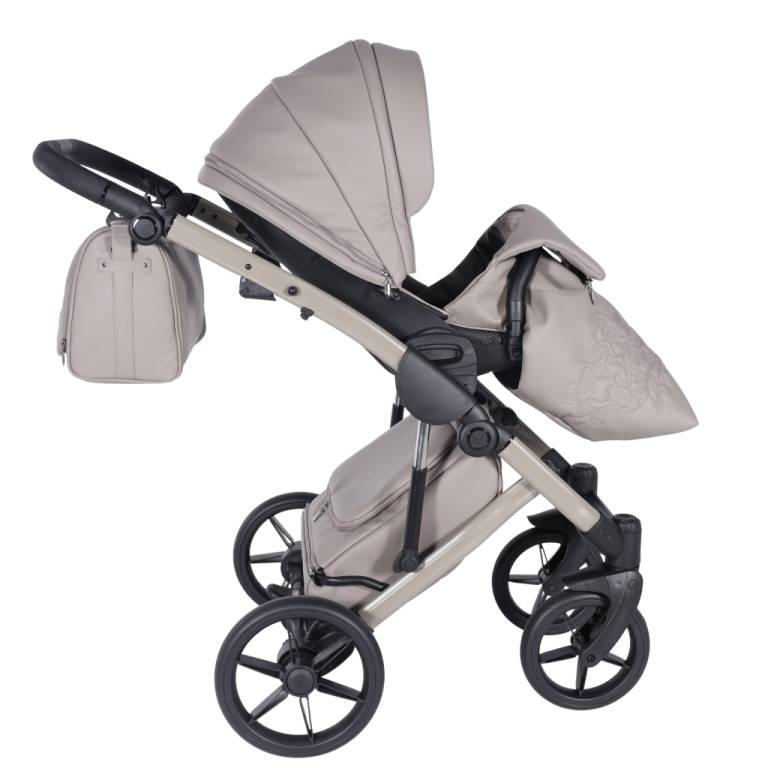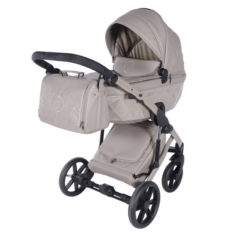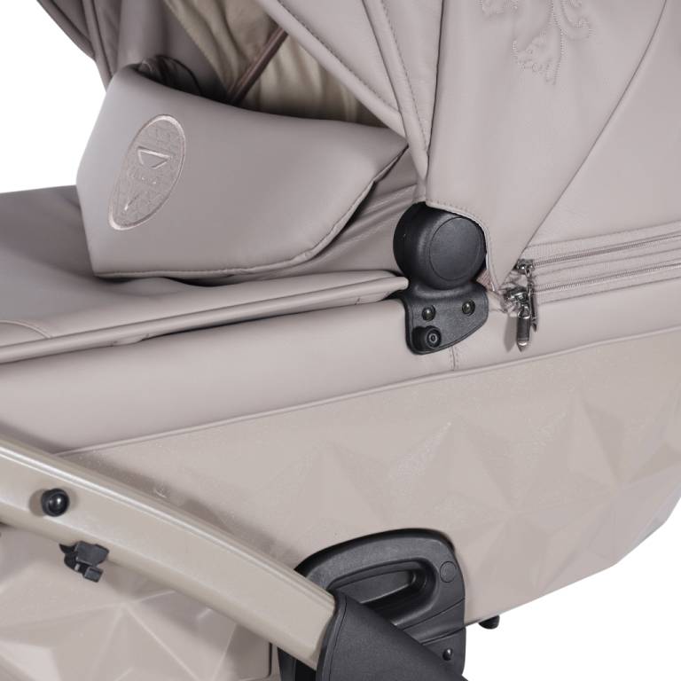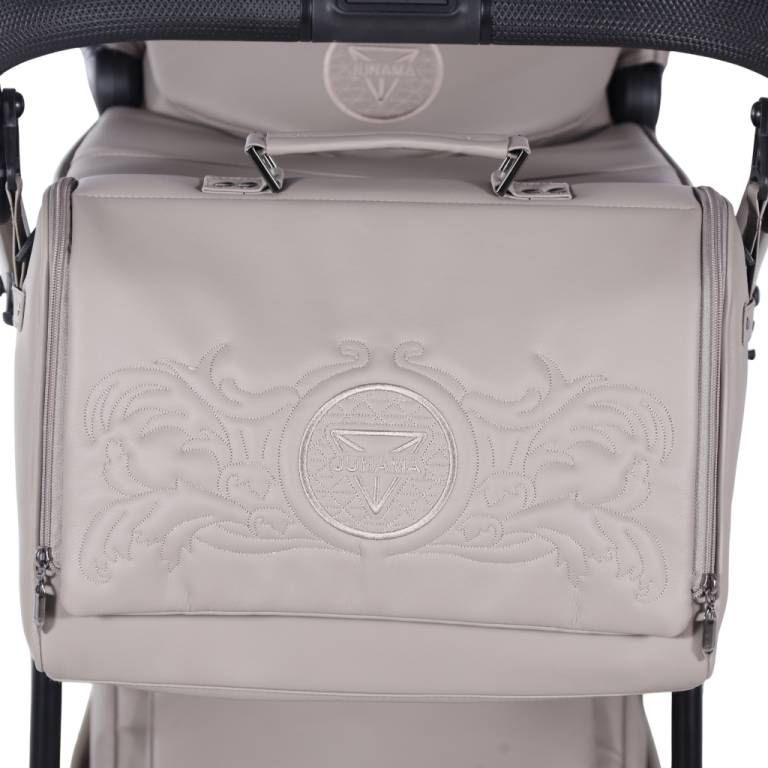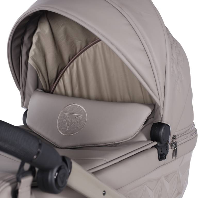 El JUNAMA ENZO es un cochecito 2 en 1 que combina un diseño moderno con capazo en forma de diamante, comodidad para el día a día y un acabado de lujo. Fabricado íntegramente en ecopiel de alta calidad, no solo es elegante, sino también excepcionalmente práctico: fácil de cuidar y resistente a la intemperie. Un elemento único que distingue al modelo ENZO es el bordado decorativo con hilo de lurex, que le da al carrito un carácter exclusivo, para padres que buscan una combinación de funcionalidad, seguridad y un estilo único que la diferencie de los modelos clásicos.