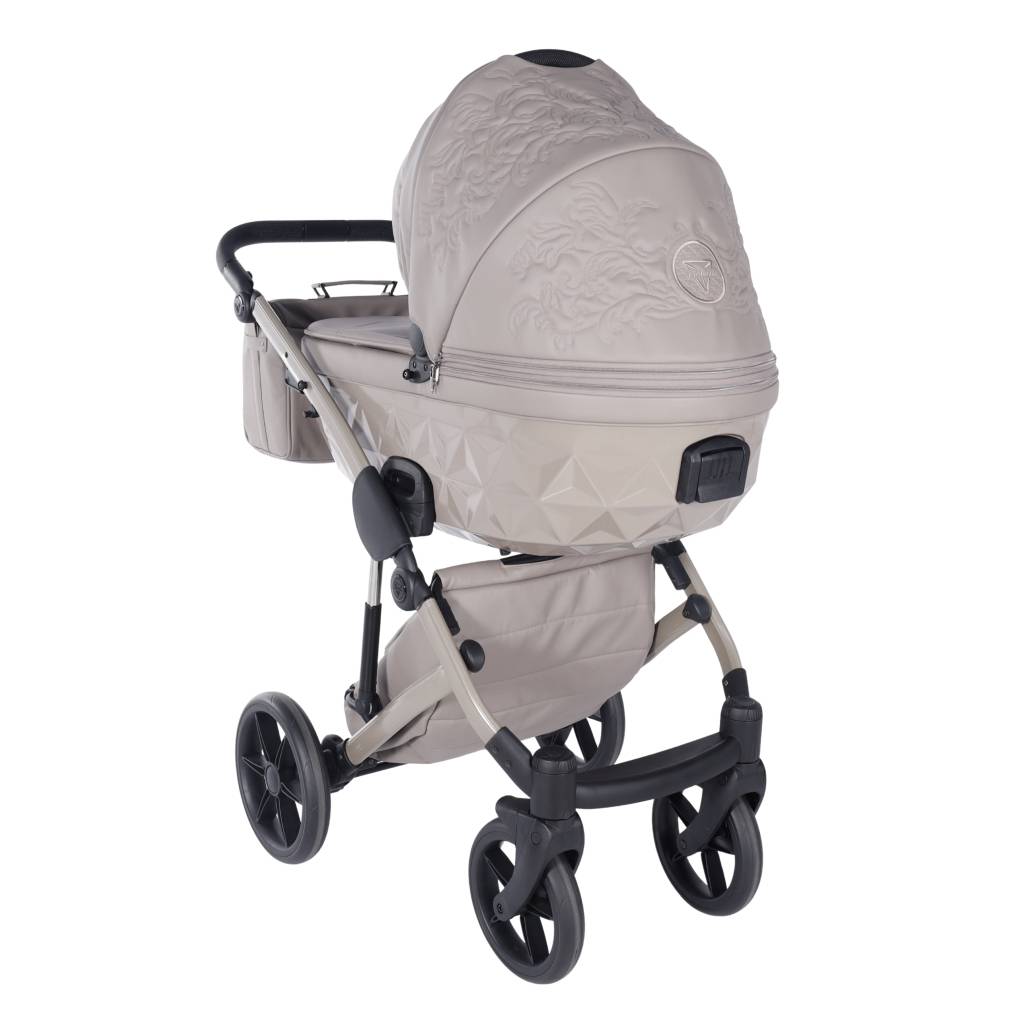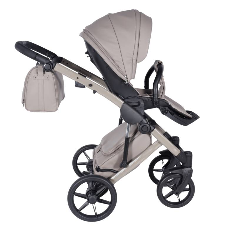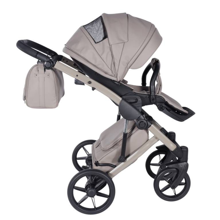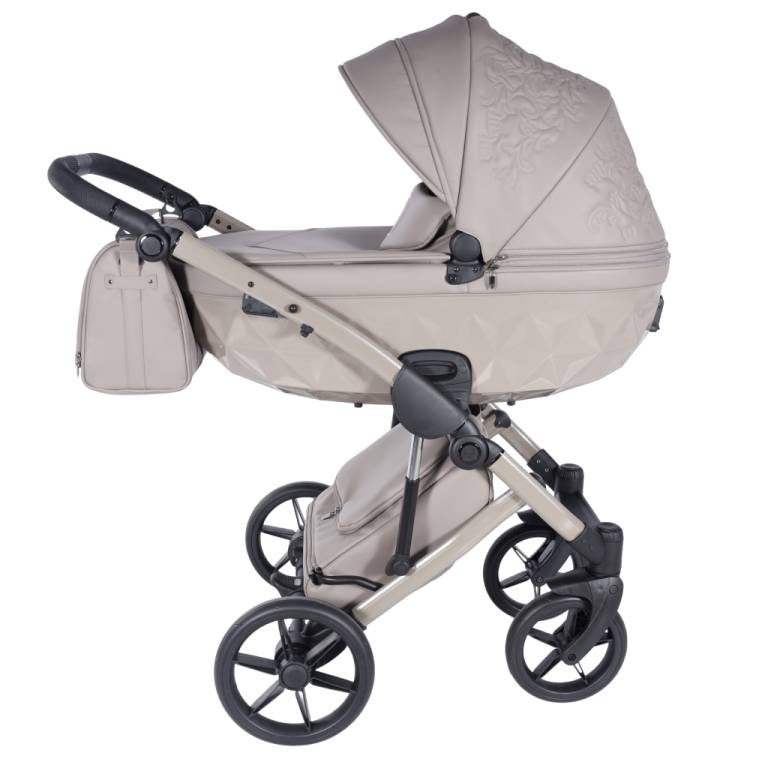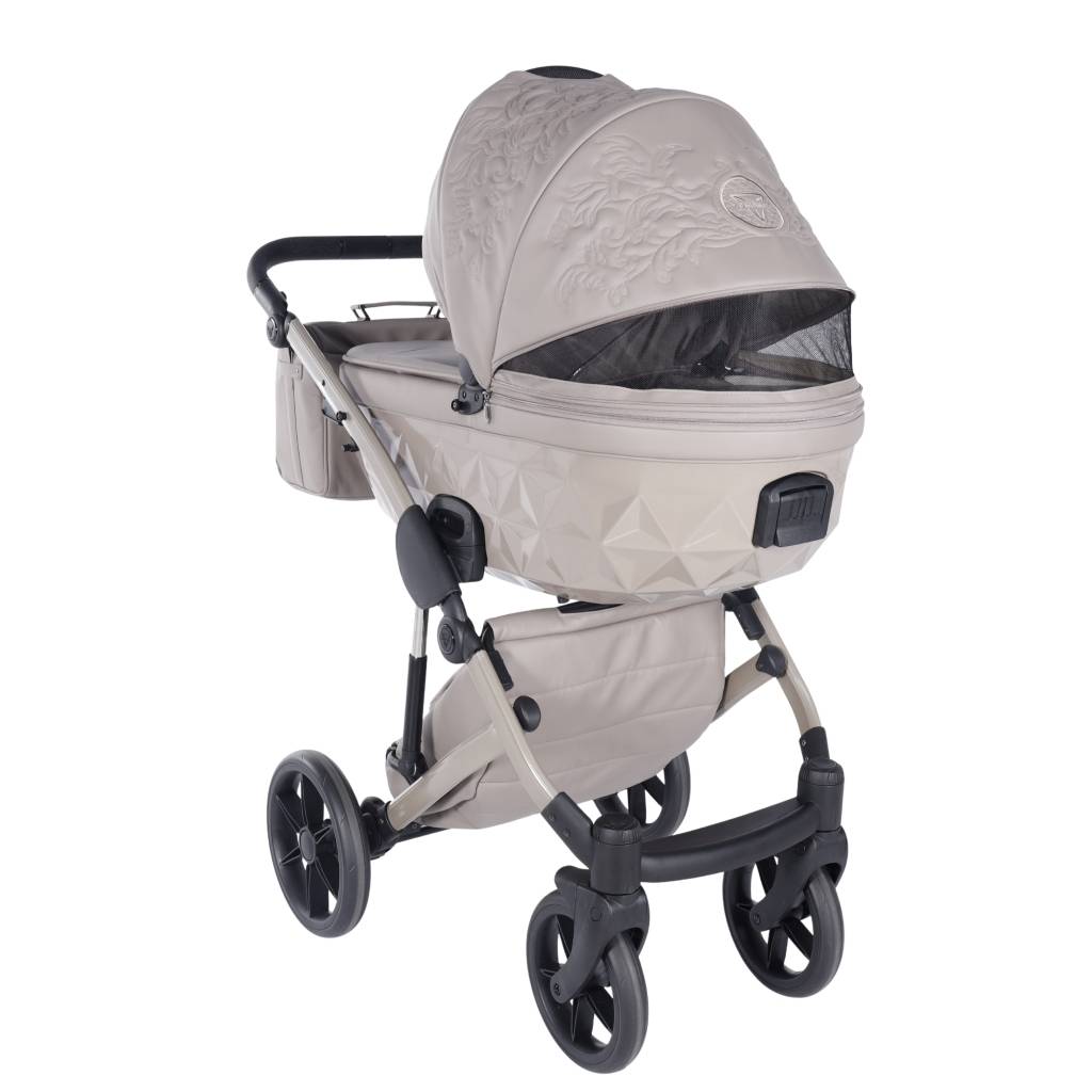 El JUNAMA ENZO es un cochecito 2 en 1 que combina un diseño moderno con capazo en forma de diamante, comodidad para el día a día y un acabado de lujo. Fabricado íntegramente en ecopiel de alta calidad, no solo es elegante, sino también excepcionalmente práctico: fácil de cuidar y resistente a la intemperie. Un elemento único que distingue al modelo ENZO es el bordado decorativo con hilo de lurex, que le da al carrito un carácter exclusivo, para padres que buscan una combinación de funcionalidad, seguridad y un estilo único que la diferencie de los modelos clásicos.