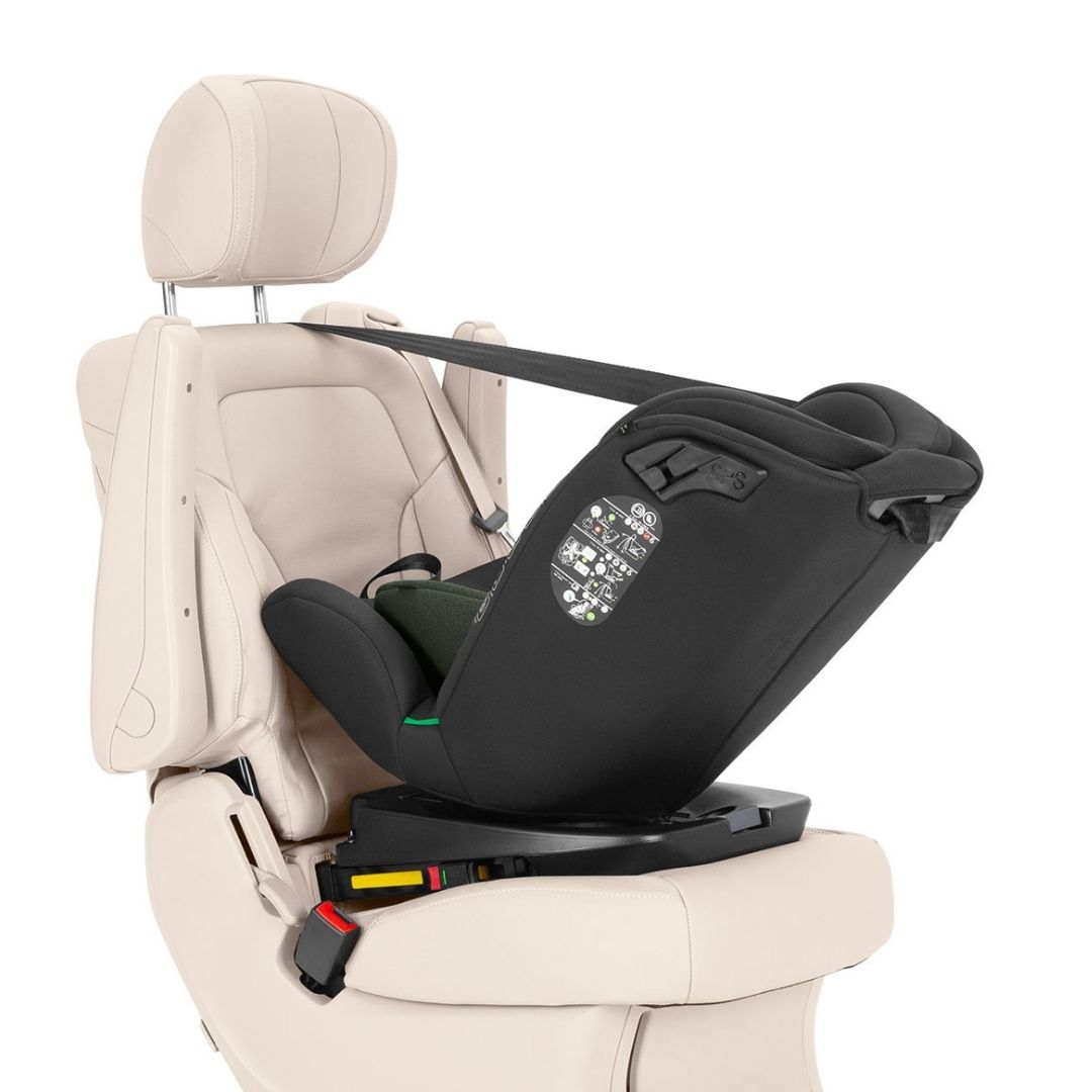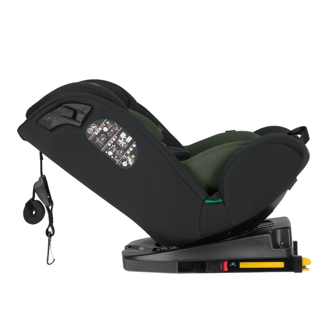 Ángulo de reclinado máximo 145º. Top Tether strap para sujetar el asiento de seguridad.