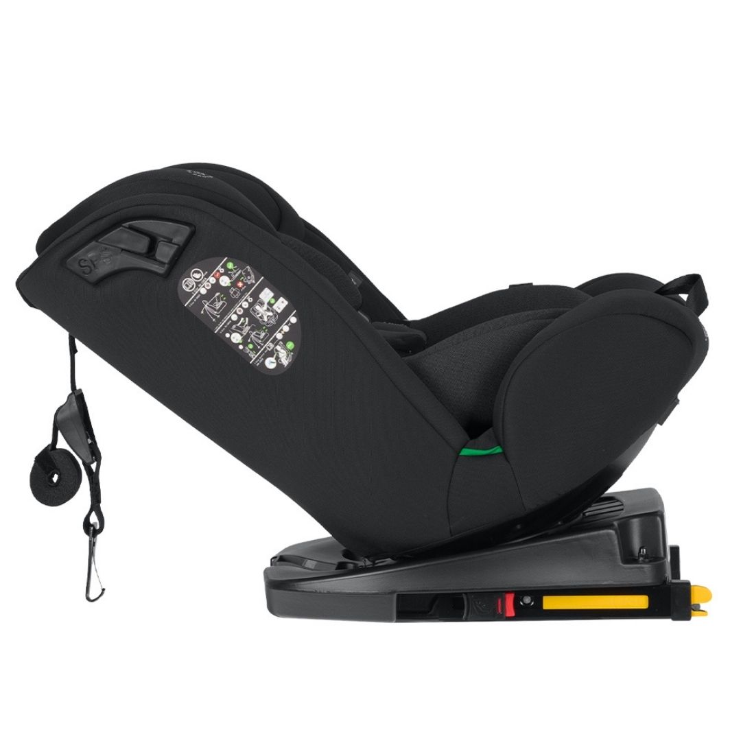 Ángulo de reclinado máximo 145º. Top Tether strap para sujetar el asiento de seguridad.